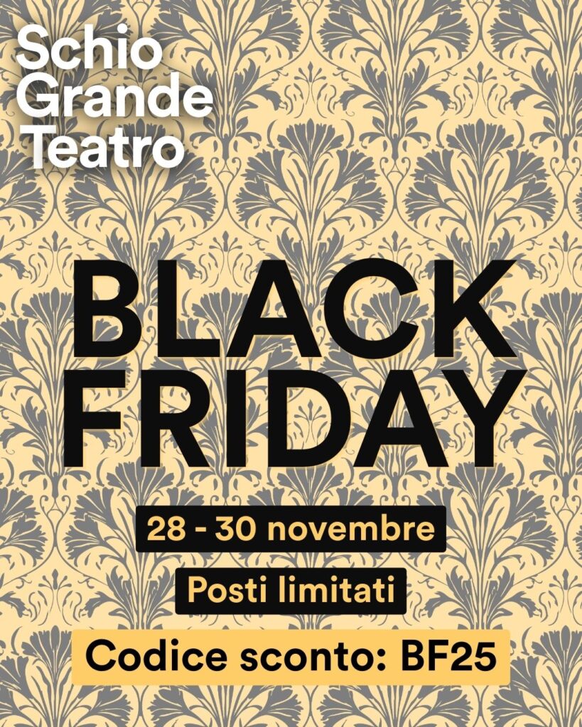 I biglietti sono acquistabili online su Vivaticket inserendo il codice sconto BF25 nella riduzione PROMO SPECIALE BLACK FRIDAY, oppure alla biglietteria del Teatro Civico.